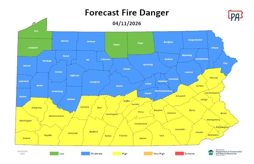 There is an elevated risk for fire spread today across southeastern Pennsylvania. Minimum relative humidity values will drop to around 25 to 35 percent this afternoon. This will be accompanied by northwesterly winds with gusts up to 20-25 MPH. These conditions, along with the continued drying of fine fuels, could support the rapid spread of any fires that ignite, which could quickly become difficult to control. Conditions improve during the evening as the wind diminishes and the relative humidity increases.